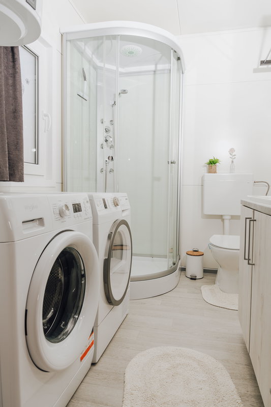 Kopalnica z brisačami, sušilcem za lase, likalnikom in pralni stroj