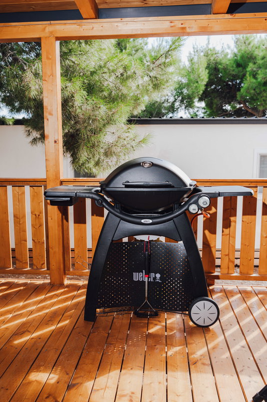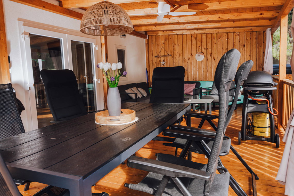 Velika pokrita terasa s plinskim žarom "Weber" in veliko mizo za 6 oseb ter sedežno kotno garnituro