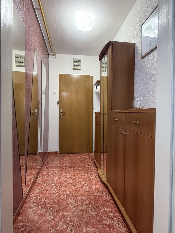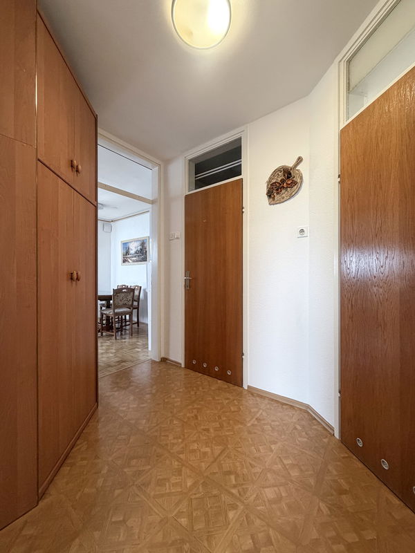 Stanovanje obsega: predprostor, prostoren osrednji dnevni prostor s kuhinjo, shrambo in jedilnico, dodatni predprostor v spalne prostore, soba 2x, kopalnica z wc, kletna shramba.